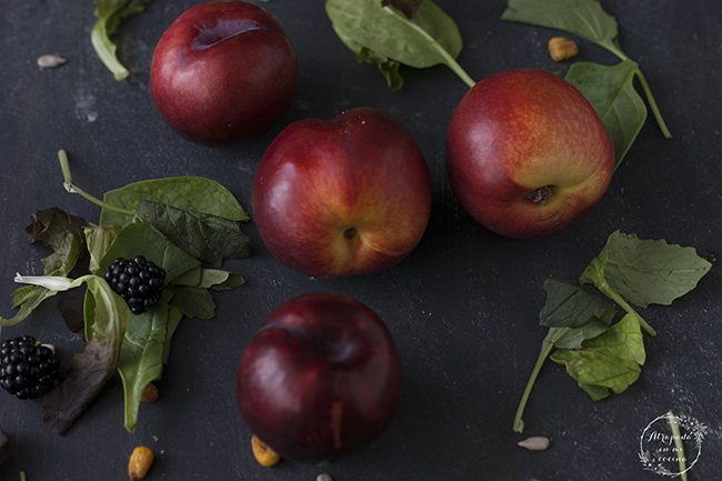 Lavamos y escurrimos bien los brotes, una vez secos disponemos sobre el plato de servicio. Lavamos bien la fruta y cortamos las ciruelas y la nectarinas en gajos sin pelar. Disponemos los trozos de nectarina en la ensalada.