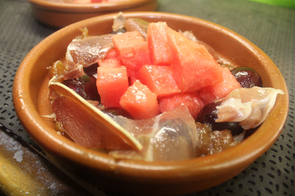 Salamos solo la sandía (el jamón ya es salado) y rociamos todo el conjunto con aceite de oliva.