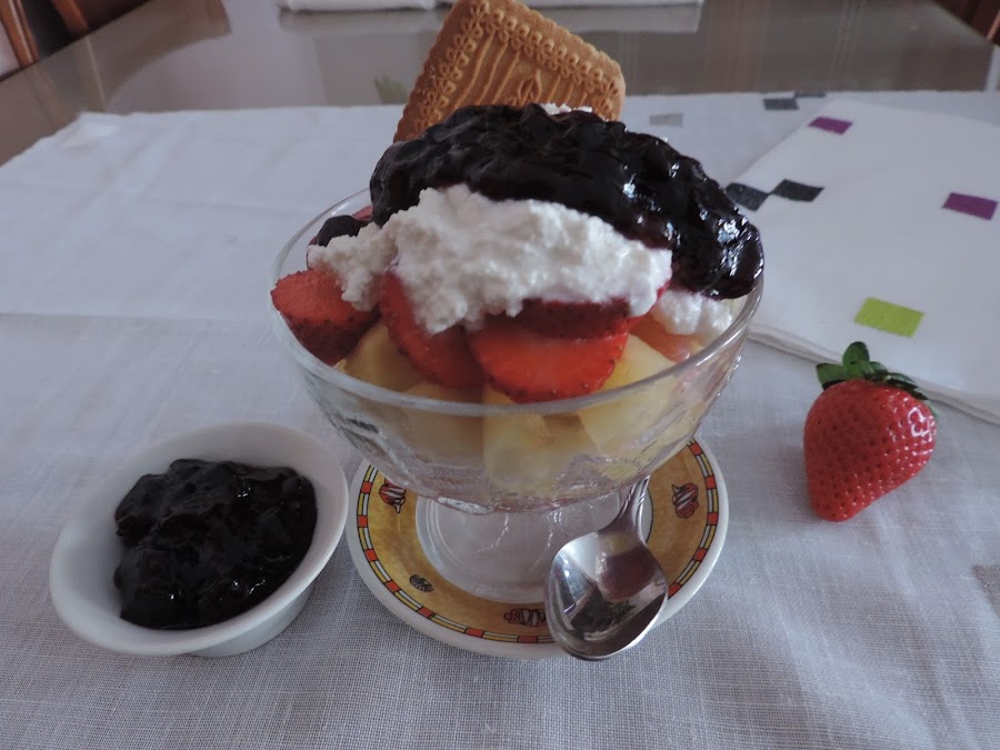 Es muy fácil, solo hay que trocear la fruta en trocitos, meterla en una copa, echarle por encima dos cucharadas buenas de requesón y por encima ponerle mermelada de cerezas. La puedes decorar con una galleta o barquillo.