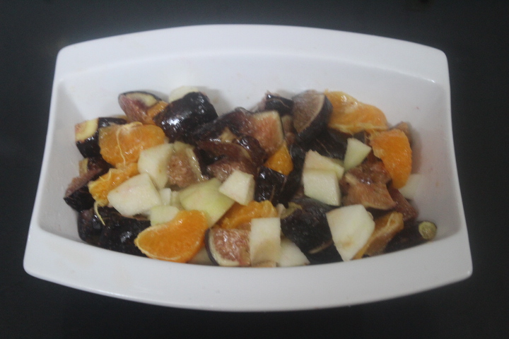 Pelamos y desechamos las semillas de la manzana y de la pera, cortamos ambas frutas a daditos similares a los que hemos realizado con los higos.