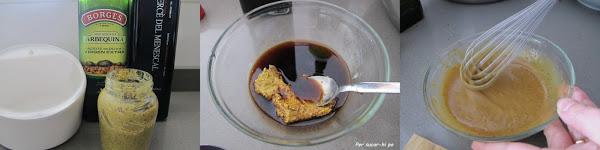 En un bol pequeño colocar una cucharada de mostaza a la miel, una pizca de sal y tres cucharadas de vinagre agridulce, remover un poco para deshacer la mostaza. Añadir unas cuatro cucharadas de aceite de oliva y batir ligeramente con unas varillas hasta que emulsione y ligue la mezcla. Lista!