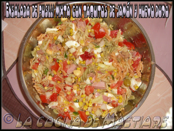 Cocinamos en agua hirviendo con sal la pasta según instrucciones del paquete, eso sí hay que procurar que esté al dente pues si se pasara de cocción estropearía la ensalada. Una vez cocida se pasa bajo el chorro del grifo para cortar la cocción y enfríarlo. Se escurre muy bien para eliminar toda el agua posible de la pasta y se pone en una ensaladera o bol con un pequeño toque de aceite de oliva. Se tapa y se mete en la nevera para que enfríe.