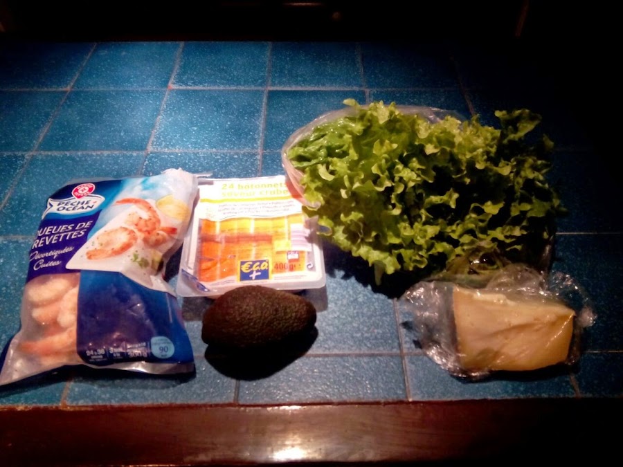 Pelamos el aguacate y lo añadimos también a la ensaladera, una vez que están cocidas las gambas, se echan a la ensaladera, se ralla un poco de queso, se sala y se aliña con lo que más os guste si no queréis sumarle más calorías a la ensalada hacerlo con aceite y vinagre, si no con mayonesao salsa rosa.