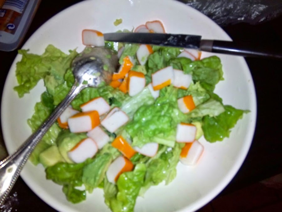 Lavamos la lechuga y la ponemos en un bol. Mientras tanto cocemos las gambas y vamos cortando el surimi en cachitos y lo añadimos a la ensaladera.