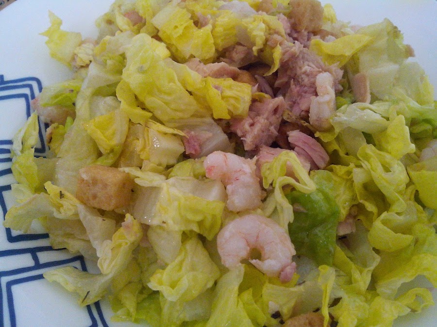 Las gambas las descongelamos si son congeladas y las ponemos en una sarten pequeña con un poquito de aceite , sal y estragon. Se hacen un poco y se añade al bol de la lechuga y el atun.