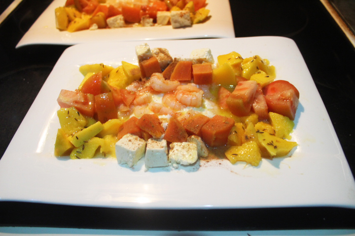 Nuevamente realizamos para cenar una ensalada de frutas, acompañada de gambas, yogurt y queso saladito.