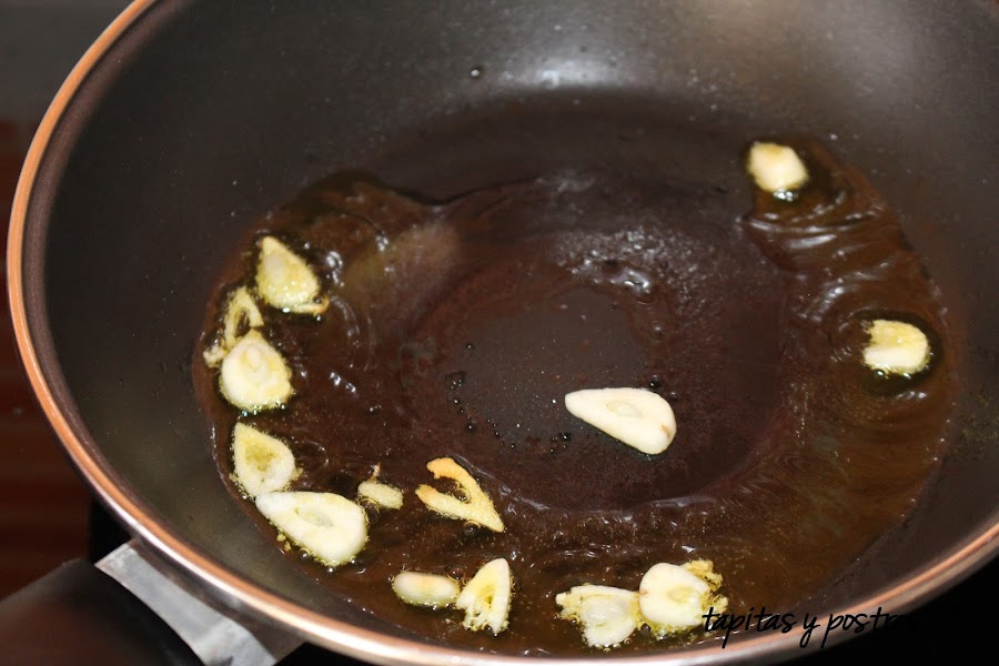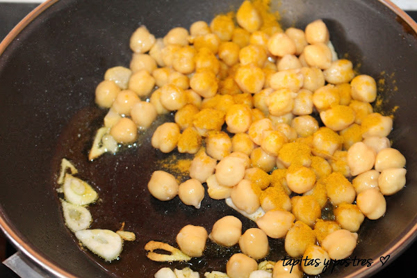 Añadimos los garbanzos bien lavados y escurridos. Agregamos el curry y damos unas vueltas. Reservamos.