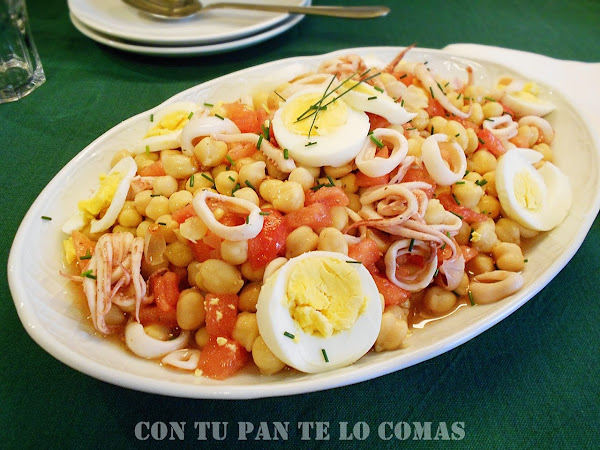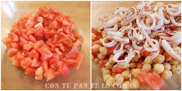 Si además encuentras chipirones o calamares pequeños en la pescadería puedes hacer una ensalada fabulosa, nutritiva, completa y muy rápida.