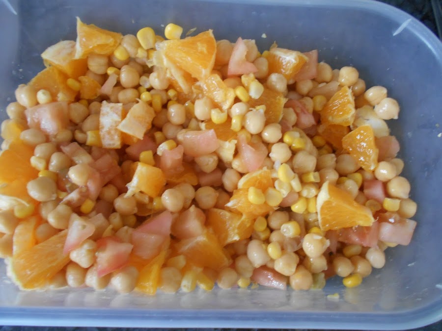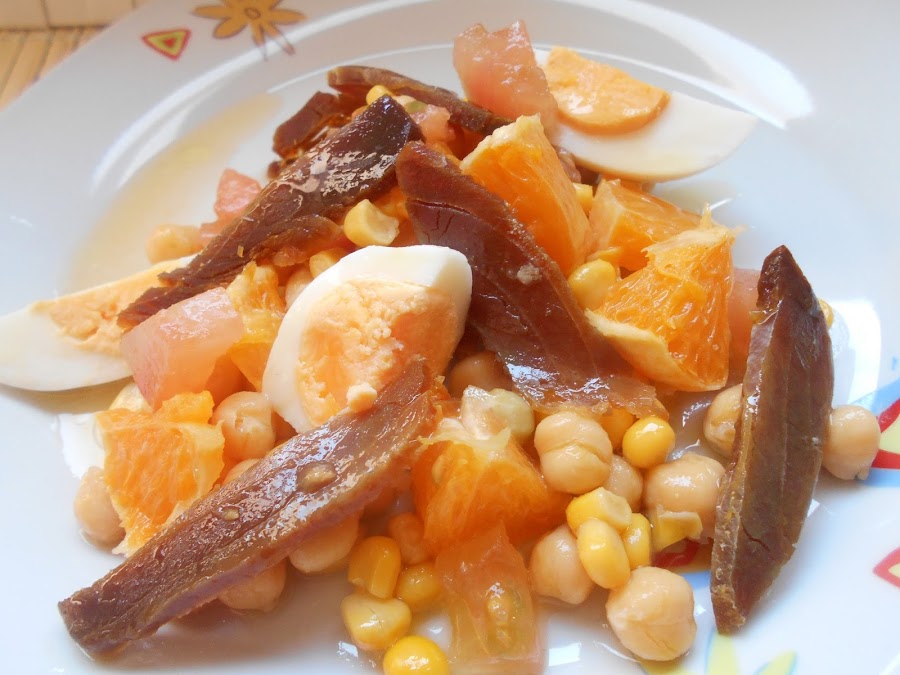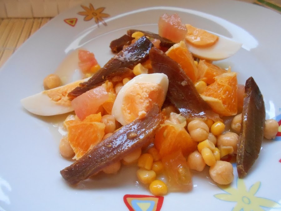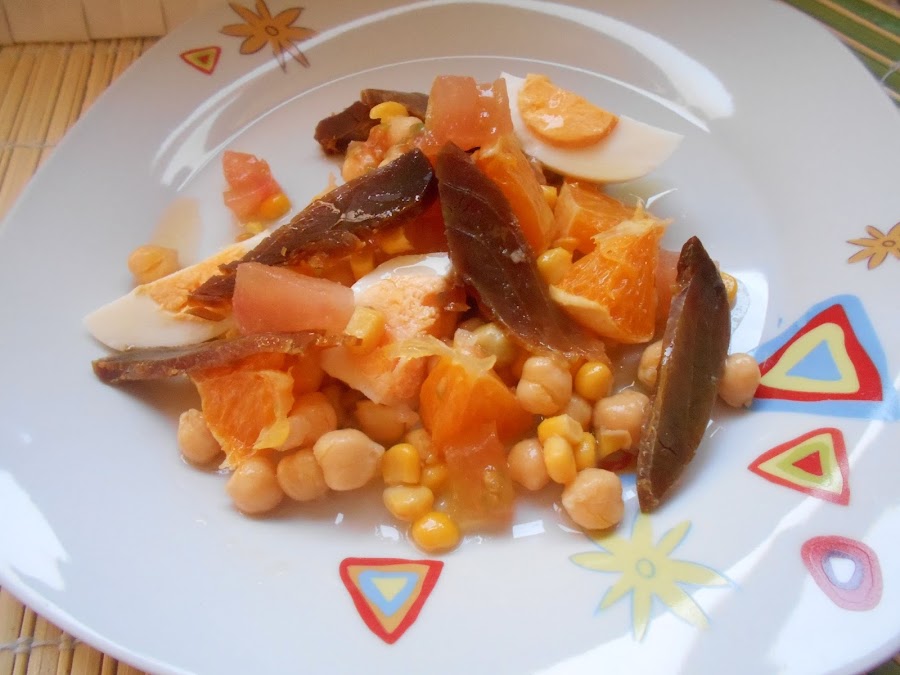 En esta ocasion la he hecho con garbanzos y mojama y para darle un toque más fresco naranja.