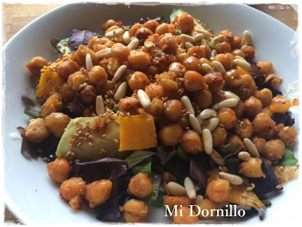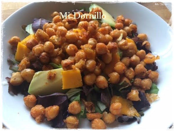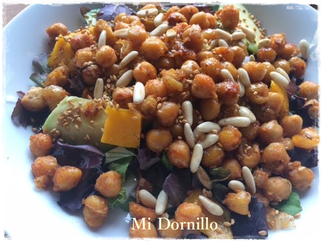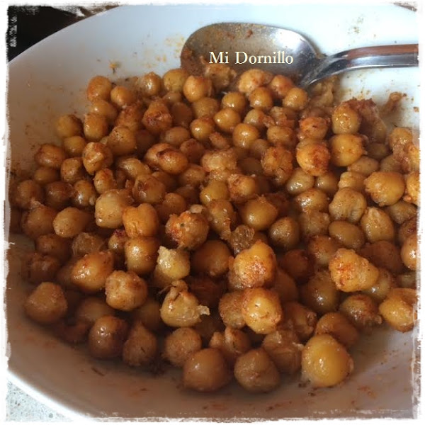 En una sarten ponemos un chorro de aceite de oliva virgen y freímos los garbanzos, cuando doren, los escurrimos bien y volvemos a ponerlos sobre papel de cocina para que absorba el aceite.Los ponemos en un plato y le añadimos todas las especias para que aun calientes, se impregnen de ellas.