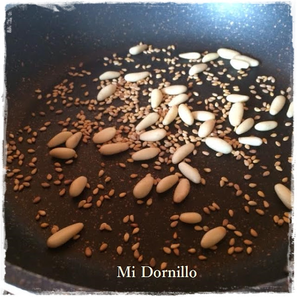 En una sarten sin aceite tostamos los piñones y el sésamo.