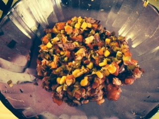 Limpiamos los pimientos asados y los picamos pequeñitos y los incorporamos al bol. Lavamos la cebolla para quitarle la sal y la echamos también al bol. Mezclamos todo bien.