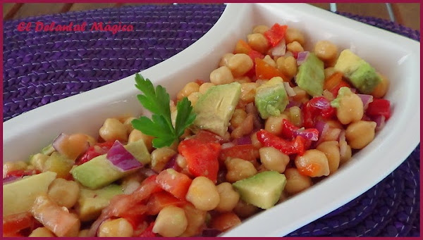 Cortamos en trozos pequeños el tomate, la cebolla, los pimientos y el aguacate y lo ponemos en un bol, añadimos sal y aceite de oliva y mezclamos bien. Por último, se lo añadimos a los garbanzos y mezclamos, probamos y si es necesario rectificamos de sal.