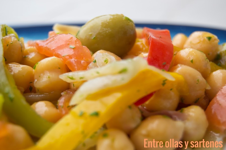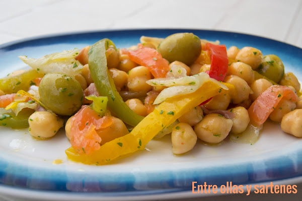 Una vez fríos las tiras de pimientos también la ponemos en la ensaladera junto a las aceitunas.