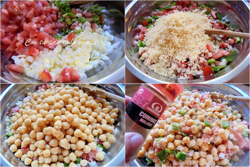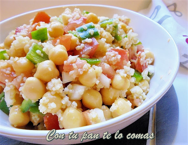 Pero con calor o sin él tenemos la costumbre de comer todos los días y ha llegado el momento de la reina del verano: la ensalada. La de hoy es la combinación perfecta desde el punto de vista nutricional al mezclar una legumbre como los garbanzos con un cereal, en este caso cuscús (sémola de trigo). La explicación un poco por encima es que las legumbres son deficitarias en metionina (aminoácido antioxidante que además evita la acumulación de grasas) y altas en lisina (otro aminoácido esencial para el crecimiento que garantiza la absorción del calcio). Por el contrario los cereales son altos en metionina y bajos en lisina, de ahí que su combinación sea ideal. Para los vegetarianos es importante ingerir proteínas vegetales de alto valor biológico, así que esta combinación lo mismo que las lentejas con arroz, es recomendable cien por cien.