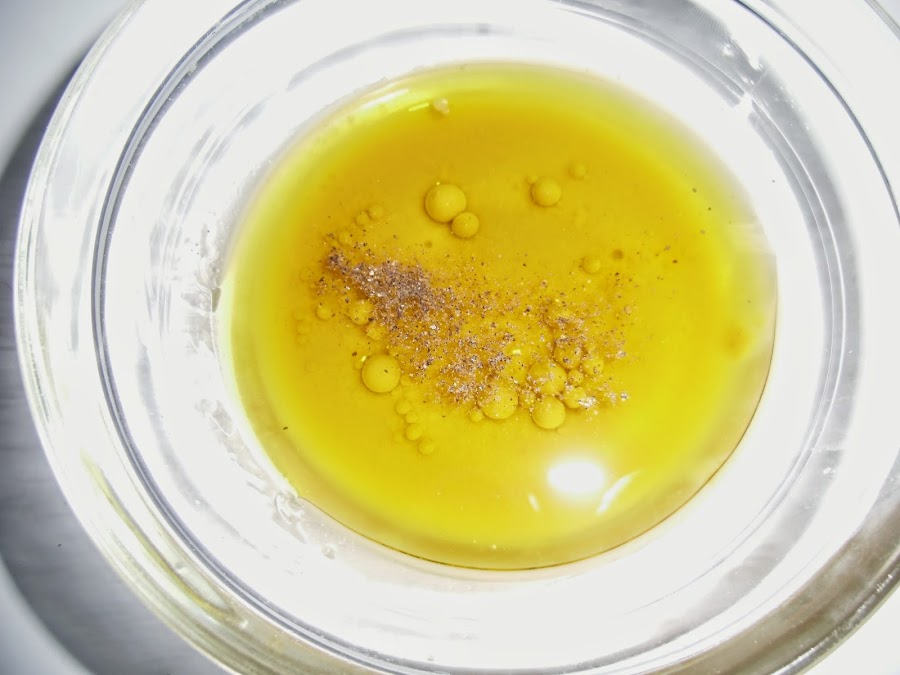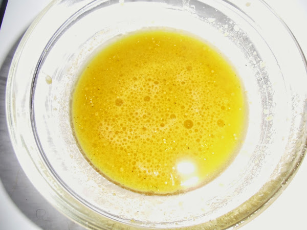 En otro recipiente ponemos dos cucharadas de mostaza, 2 cucharadas de vinagre de manzana, medio vaso de aceite de oliva, sal, pimienta negra molida y una cucharada de comino molido y mezclamos enérgicamente hasta emulsionar.