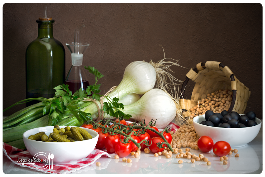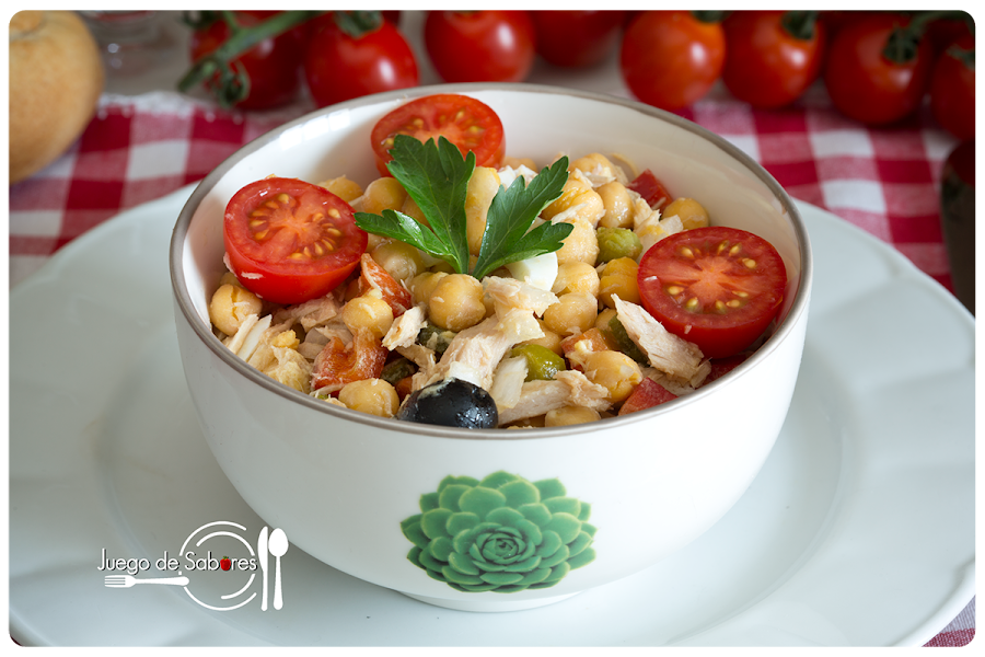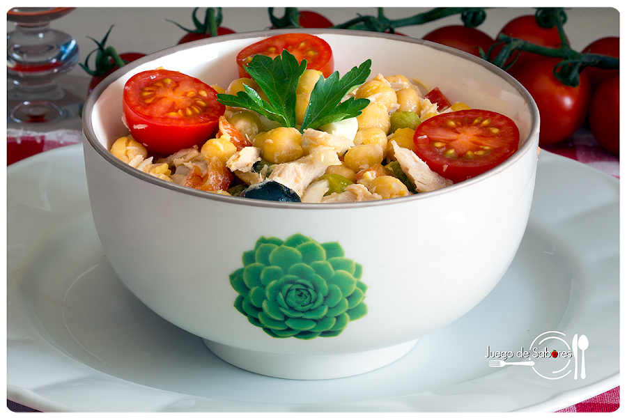 Aprovechando unos garbanzos de Fuentesaúco que nos regaló una amiga hemos elaborado esta receta que es tan sencilla que casi da sonrojo publicarla. Parece que los blogs de cocina estén pensados para hacer grandes platos. Es un error creerlo así porque en el día a día nadie se lía a hacer cosas complicadas. Si el producto es bueno –y en este caso estamos hablando de unos gabanzos con IGP indicación geográfica protegida de la provincia de Zamora- con cuatro cositas más te queda un primero de lujo. Los garbanzos son imprescindibles para un cocido que se precie. Pero cuando aprieta el calor y dejamos de lado los potajes, esta legumbre puede adquirir protagonismo en una ensalada veraniega como la que hoy os proponemos.