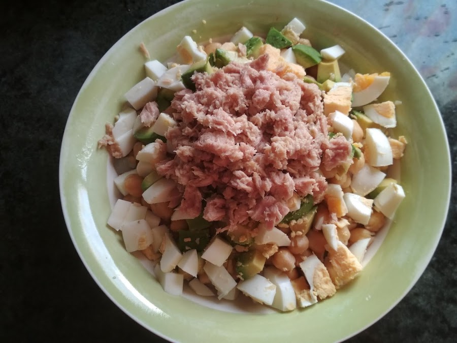 Enjuagamos los garbanzos con agua, los escurrimos y los ponemos en una ensaladera, añadimos el tomate pelado y troceado pequeño, añadimos la cebolleta en brunoise, el aguacate, el huevo duro pelado y troceado, la lata de atún y si os gustan unas aceituna partidas por la mitad. Le ponemos sal y removemos con cuidado.