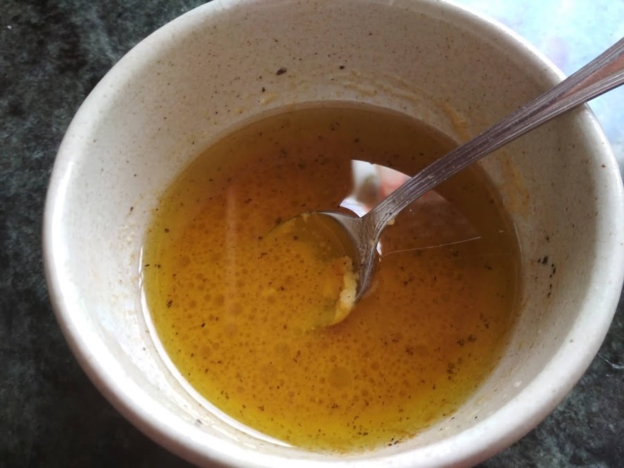 Ahora vamos a preparar la vinagreta, yo suelo utilizar vinagres variados, cada uno me gusta para una cosa pero tengo que reconocer que a esta ensalada lo que le va es el limón así que en un bote limpio y seco escurrimos medio limón, ponemos la mostaza, el aceite al gusto yo suelo poner como 3 veces más que de limón y a mí personalmente con los garbanzos me gusta el sabor de las especias tipo comino o si tenéis Ras el hanout, se tapa el bote y lo movemos enérgicamente. Yo lo he hecho en una salsera para que lo veáis mejor.