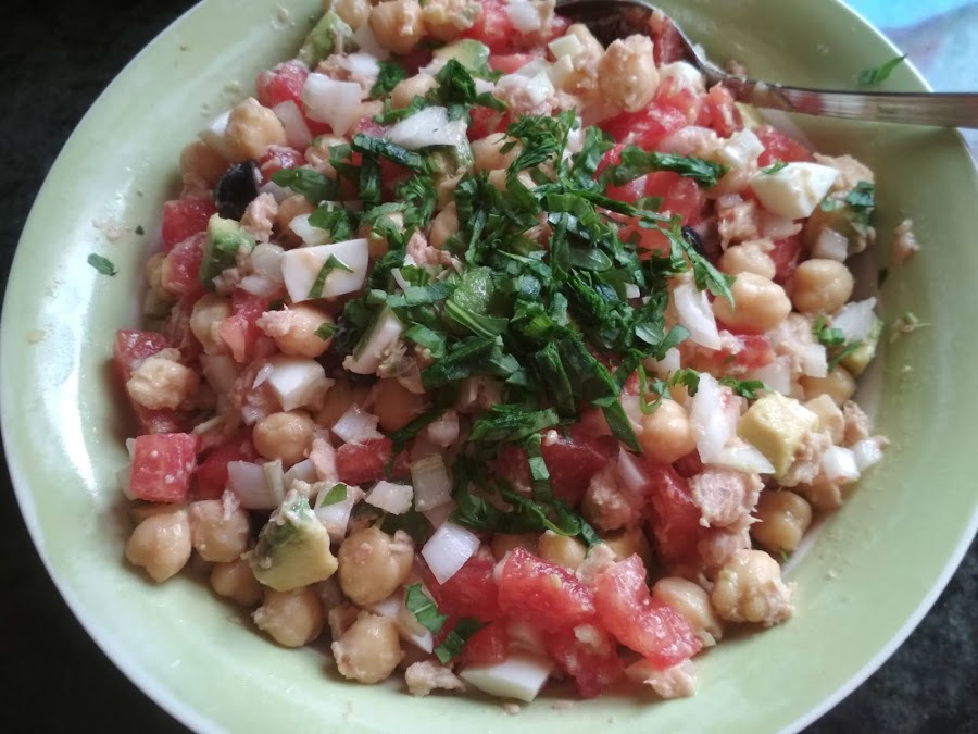 Para este tipo de ensalada sea de la legumbre que sea recomiendo hacerla con unas 2 horas mínimo de antelación y dejarla aliñada en la nevera, los sabores se mezclan y la vinagreta la impregna de sabor resultando un plato delicioso. Otra recomendación es elegir una buena legumbre, se pueden hervir o usar las de bote como hago yo que es más cómodo.