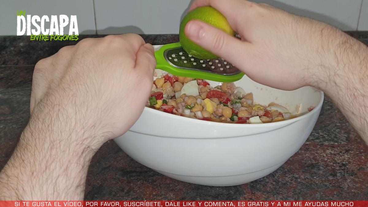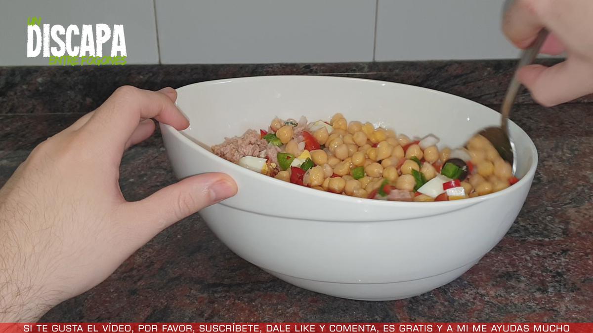 2Mientras se cuecen los huevos, nos ponemos con los demás ingredientes. En un recipiente añadimos los garbanzos bien limpios y escurridos, yo estoy usando unos garbanzos de bote ya cocidos, pero si preferís cocerlos vosotros mismos pues no hay problema. Ahora cortamos medio pimiento rojo y lo vamos troceando en pedazos pequeños, más o menos de este tamaño. A medida que vamos cortando los ingredientes, los vamos incorporando al recipiente. Hacemos lo mismo con el pimiento verde. Ahora cogemos media cebolleta y también la troceamos en pedazos pequeños. Ahora partimos por la mitad unas aceitunas negras. Y partimos unos tomates cherrys, yo los voy a partir en cuartos. Ahora troceamos los huevos que ya estarán cocidos. Le añadimos también unos 100 gramos de atún. Y mezclamos bien.