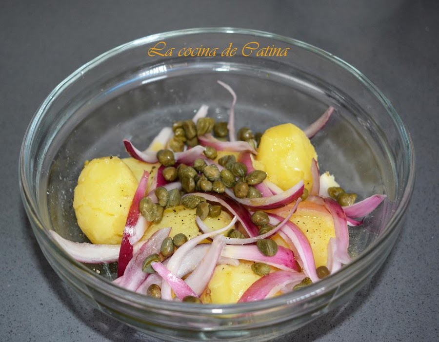 Las patatas ya estarán cocidas, las cogemos y les quitamos la piel y las colocamos en un cuenco y añadimos las alcaparras con el zumo de limón, 5 cucharadas de aceite de oliva virgen, sal, pimienta y la cebolla cortada muy fina. Removemos todo bien.