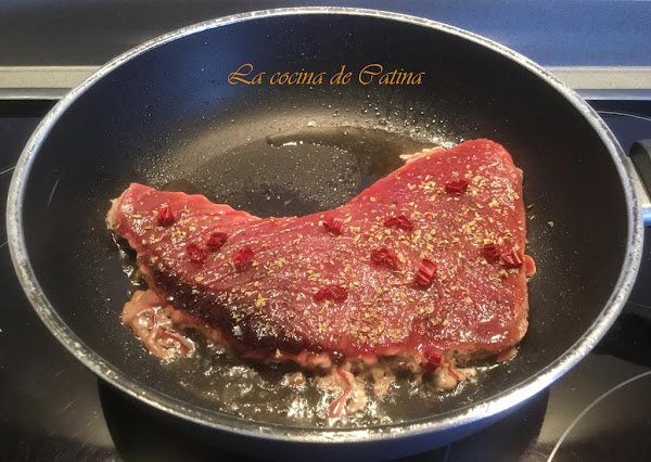 Si utilizamos el atún fresco, (como es mi caso), lo ponemos en una sartén anti-adherente con un poco de aceite de oliva, un pellizco de orégano, sal y pimienta y la guindilla picada. Lo salteamos nada más, de modo que conserve el color rosado en el centro.