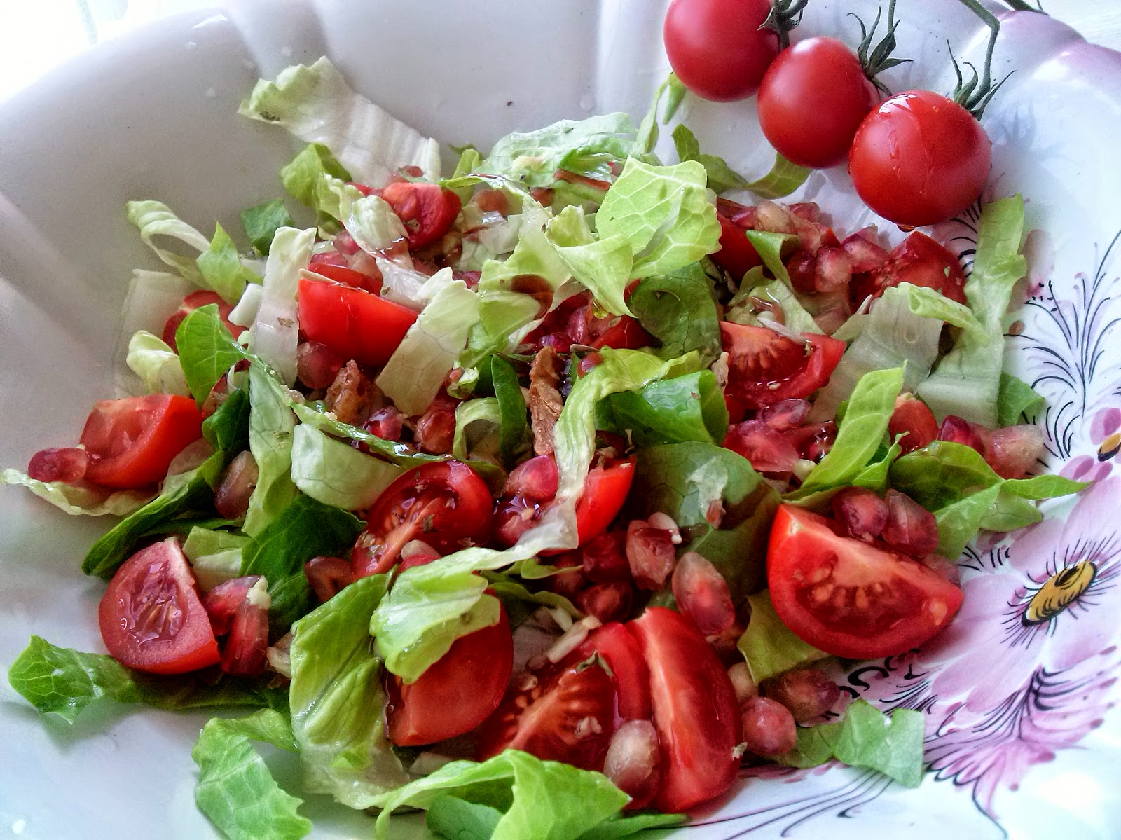 Lava bien la lechuga y trocea fina , escurre. Lava los tomatitos y córtalos en cuartos. Desgrana la granada.