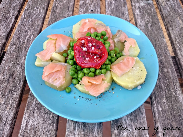 Preparamos la ensalada "dibujando" en el plato una corona con la patata. En el centro colocaremos los guisantes. Aliñamos con aceite de oliva. Sobre las patatas colocaremos el salmón y sobre los guisantes el pimiento rojo asado. Terminamos con pimienta negra recién molida y unas escamas de sal.