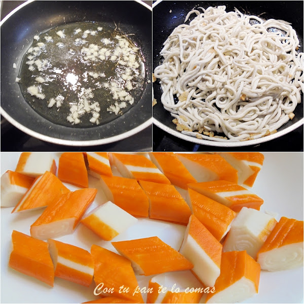 1. Hacemos las angulas sucedáneas al ajillo sofriendo el ajo picado en una sartén con aceite de oliva hasta que coja un poquito de color.