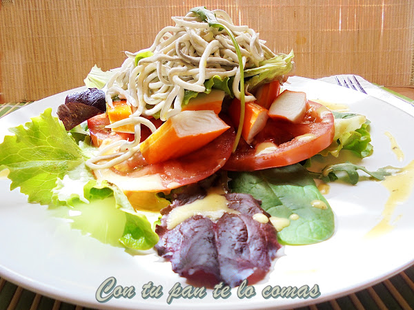Montamos la ensalada en cada plato con una base de lechugas variadas, tomates en rodajas, los palitos de surimi y las angulas sucedáneas al ajillo. Ahora solo nos falta ponerle el aliño tan rico que hicimos y listo.