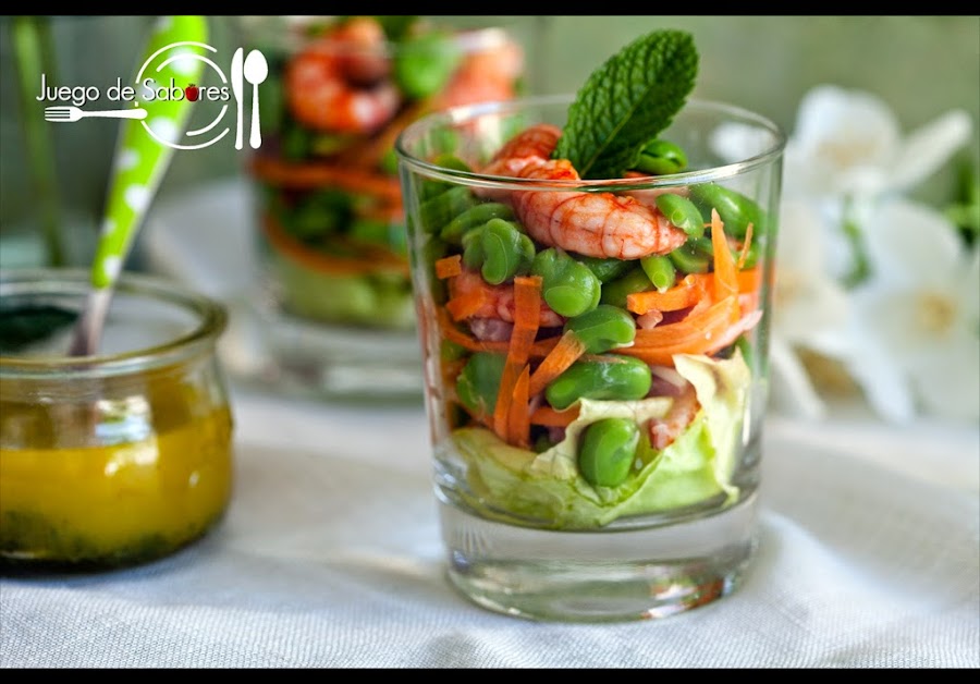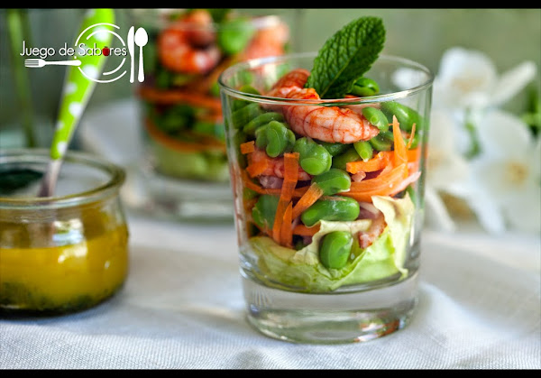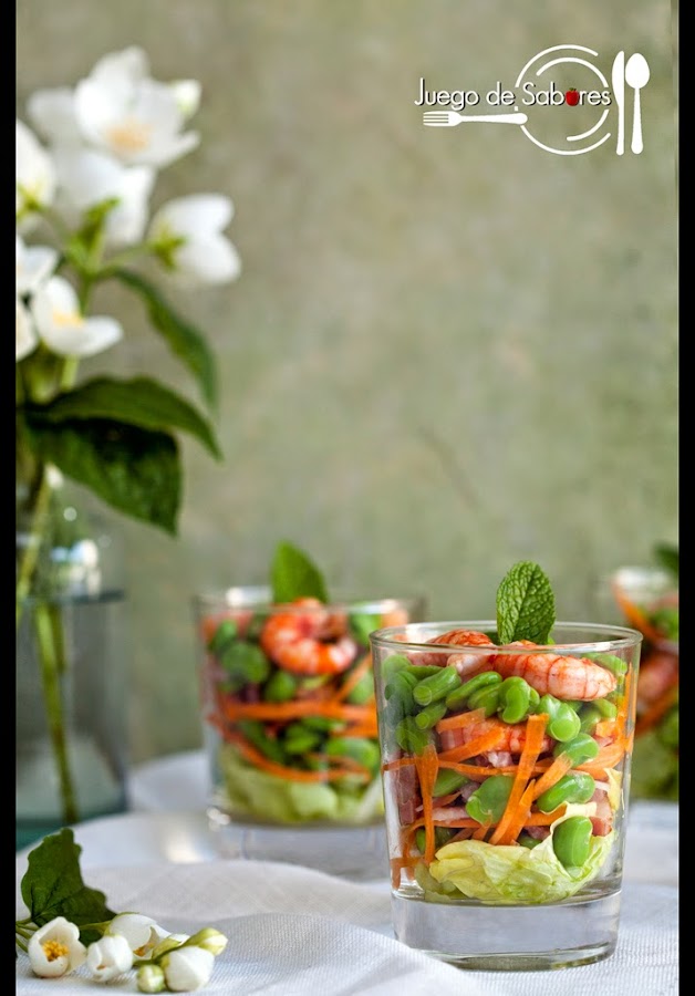 Pensamos que esta ensalada de habas, gambas y unos pocos ingredientes más os ha de gustar. Es una ensalada moderna, fresca, que servida en estos vasitos se hace atractiva a la vista.