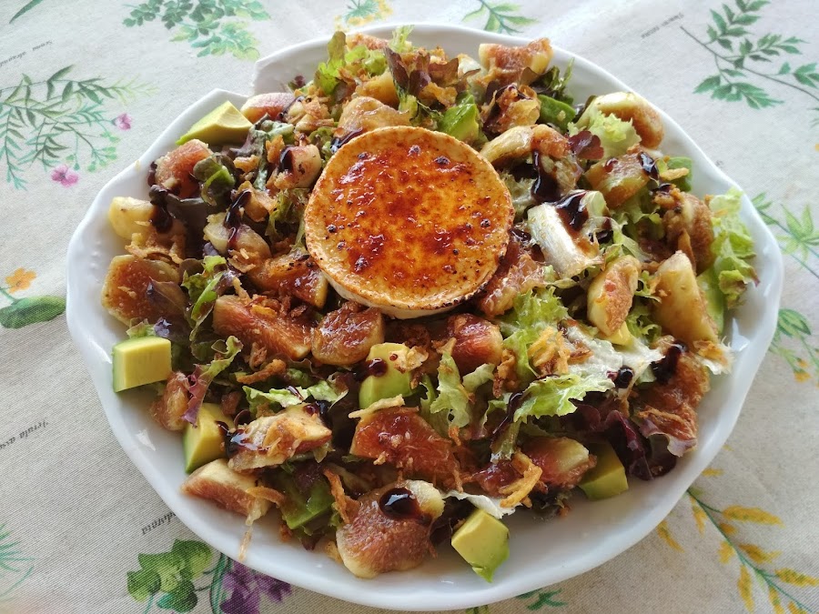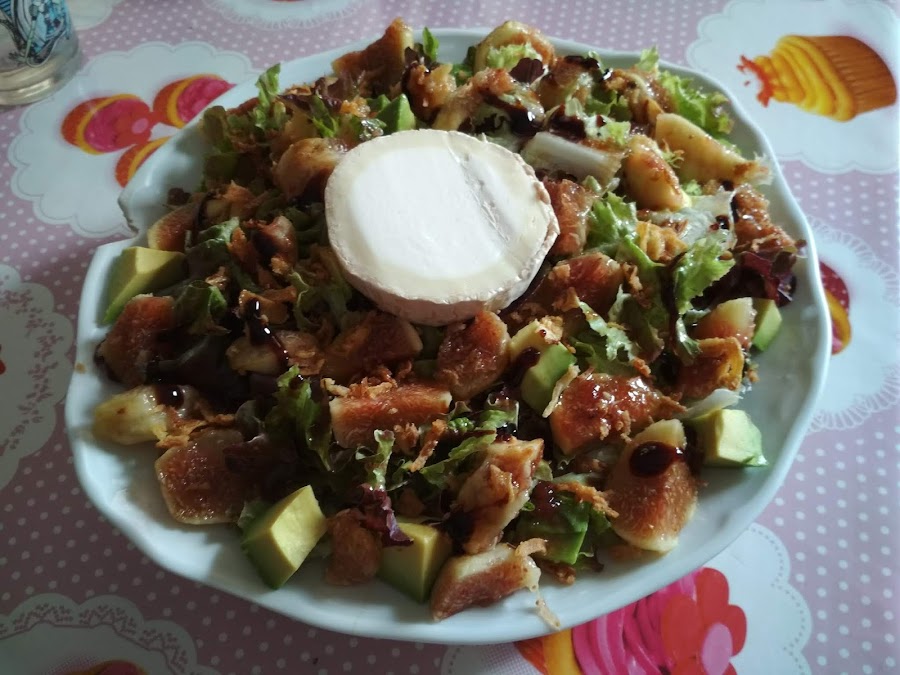 Se coloca la lechuga en la base, se disponen los trozos de higo y de aguacate por todo el plato menos en el centro, ahí pondremos después la rodaja de queso.