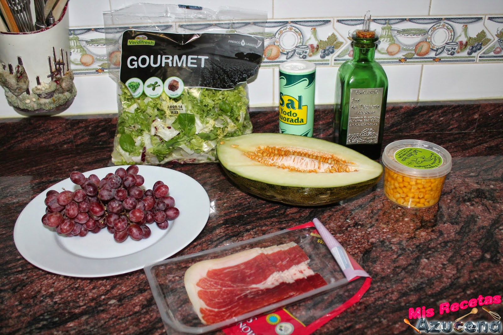 Ahora cogemos una fuente grande, ponemos las hojas de ensalada, el melón le pelaremos y lo cortaremos en trozos no muy grandes, lo añadiremos a la ensalada.