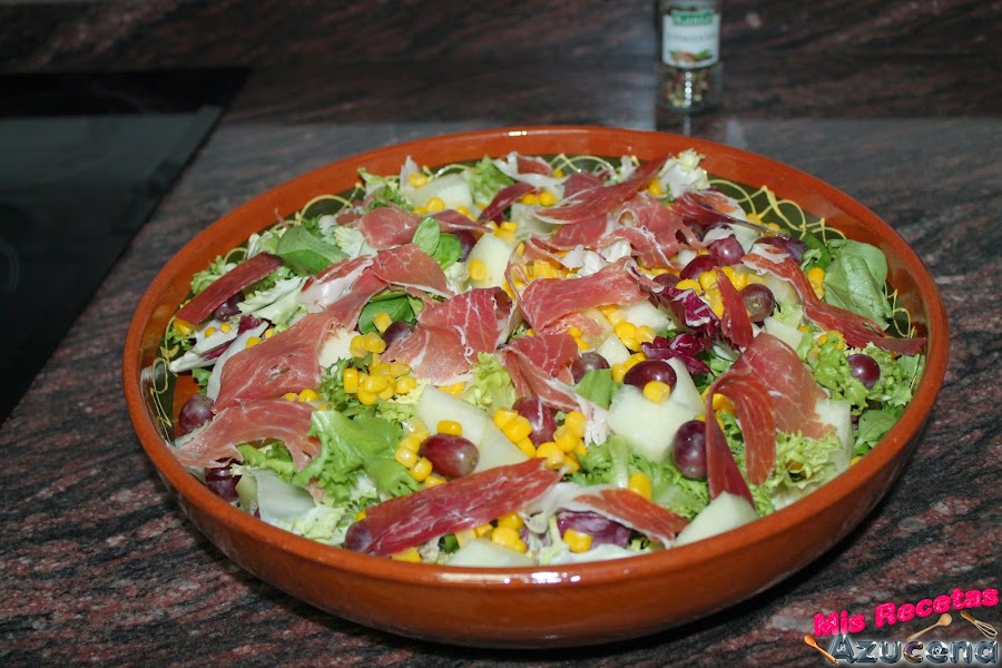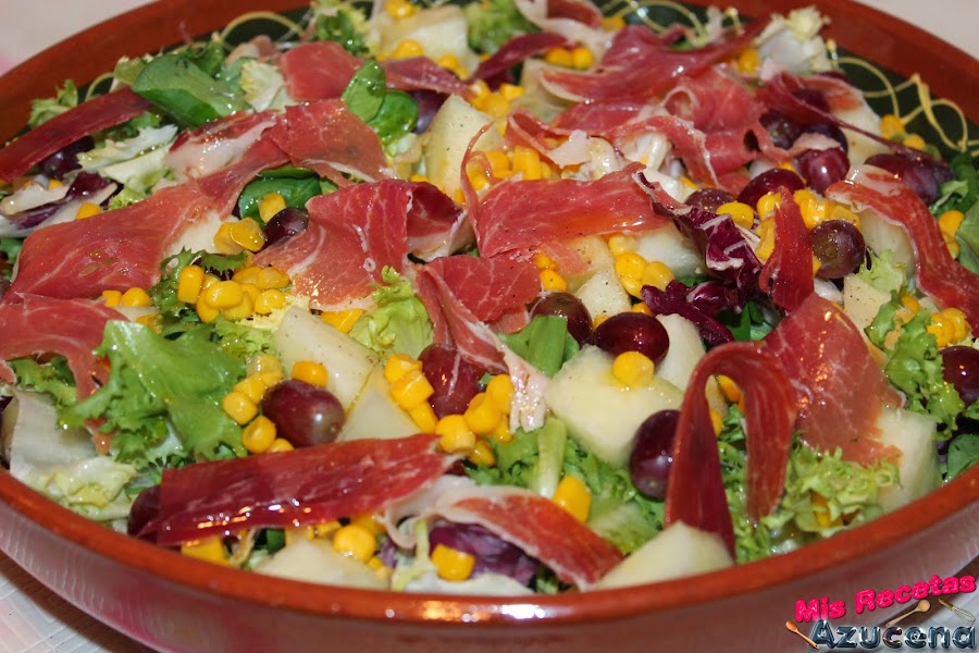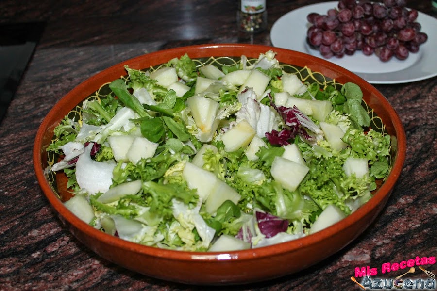 Esta ensalada viene bien como plato único, en mi casa las solemos preparar sobre todo para cenas, comes variedad sin exceso, yo hoy como estoy en ese plan de aligerar un poco la comida, ha caído este medio día, me encanta este tipo de ensalada, esa mezcla de dulce y salado es muy agradable.