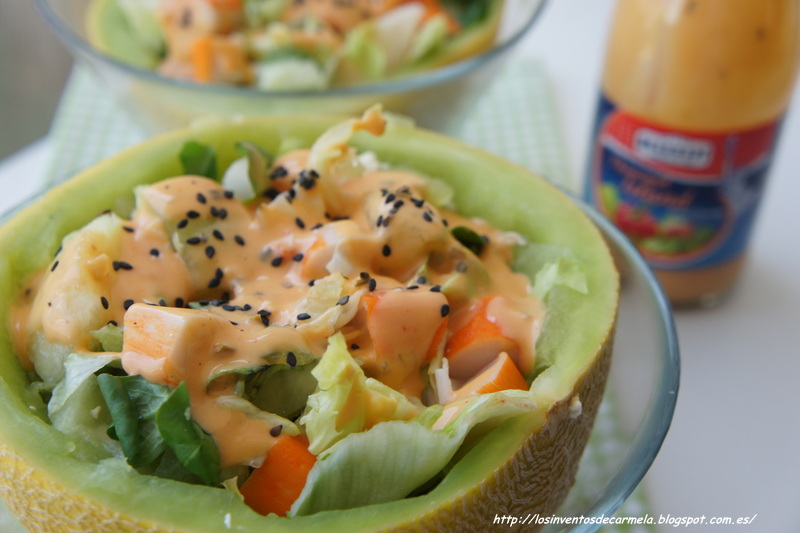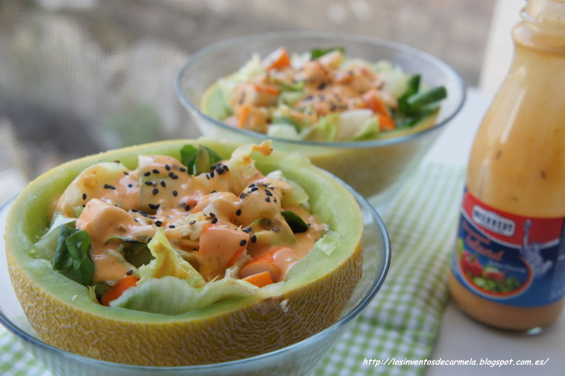 Es una ensalada con mucha personalidad y muy refrescante, y es que en mi tierra ya rozamos los 30º así que vamos a ir haciendo acopio de recetas frescas y fáciles para no estar demasiado tiempo en la cocina. Servida en las mitades de melón le da un aire más festivo, ideal para una mesa de invitados, espero que os animéis a probarla y me contéis qué tal os parece.