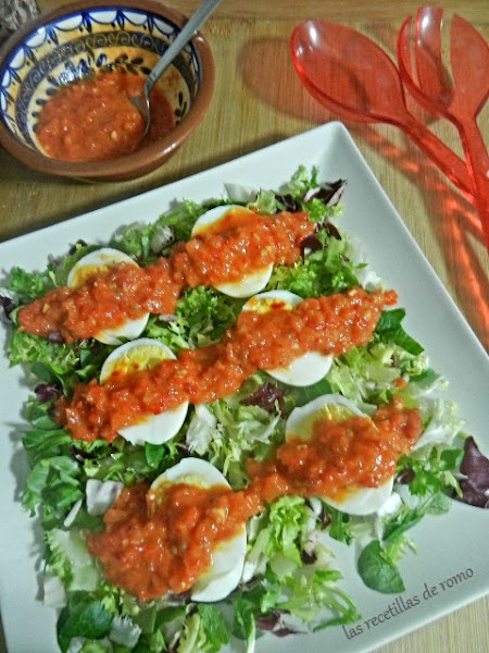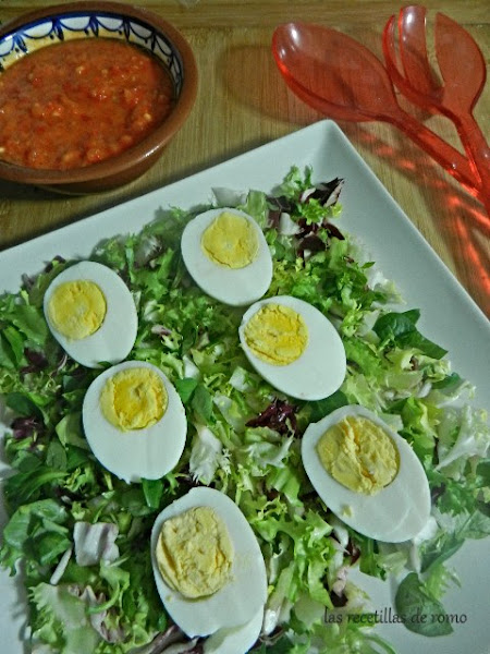 Esta ensalada de huevos duros con vinagreta de pimientos la saqué de un libro muy antiguo, del que ya he publicado otras recetas, que se llama "Menús familiares" y tiene unos platos sencillos pero muy apañados.
