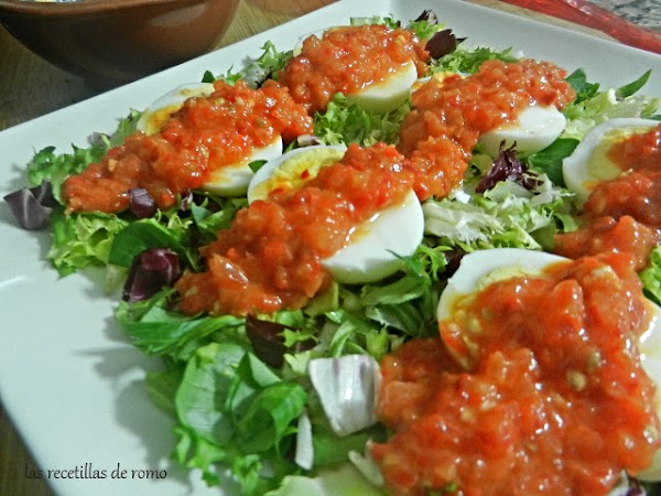 La recetilla de hoy nos va a solucionar la cena; vamos a preparar una ensalada de huevos duros con vinagreta de pimientos en tan sólo un ratito y ya verás lo buena que está.