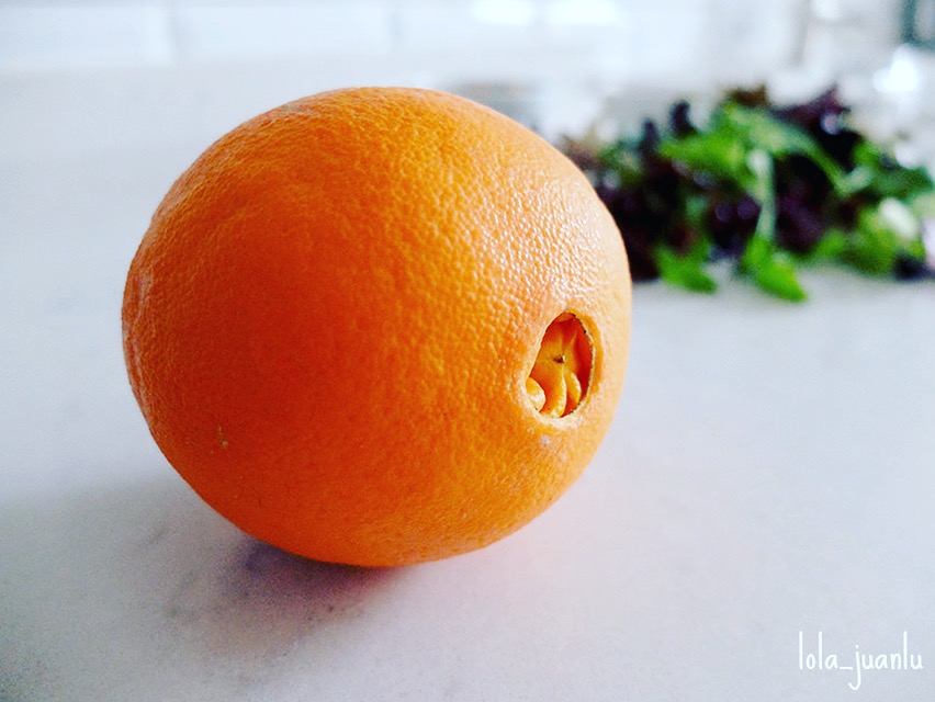Pelamos la naranja y la cortamos en medios gajos. Reservamos.