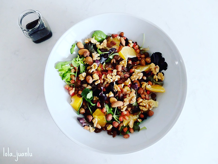 Otra variante de esta ensalada que queda muy bien es sustituyendo los frutos secos y pasas que hemos utilizado por pistachos. El color carmín de la granada contrasta con el verde del pistacho, los naranja de la fruta y las tonos otoñales de la ensalada.