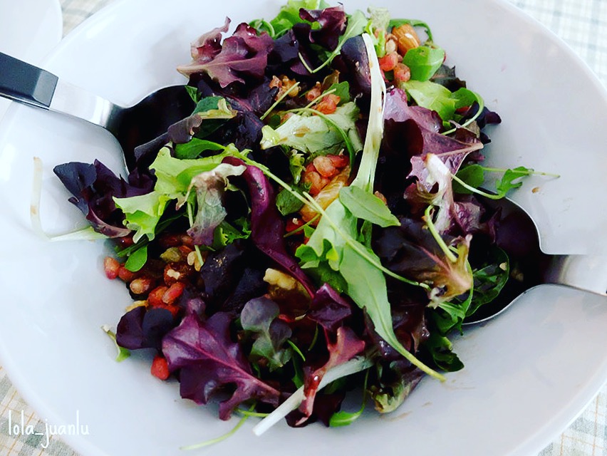 He elegido como base para la ensalada una mezcla de hojas tiernas de 8 variedades distintas que le aporta diferentes texturas, colores y sabores: espinaca, brote de lollo rojo, rúcula red chard, savia roja, brote batavia verde, brote batavia roja y tatsoi.