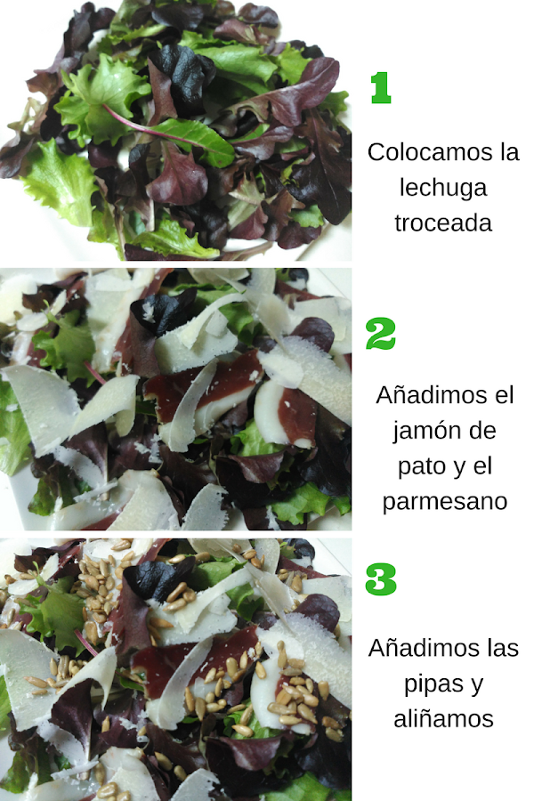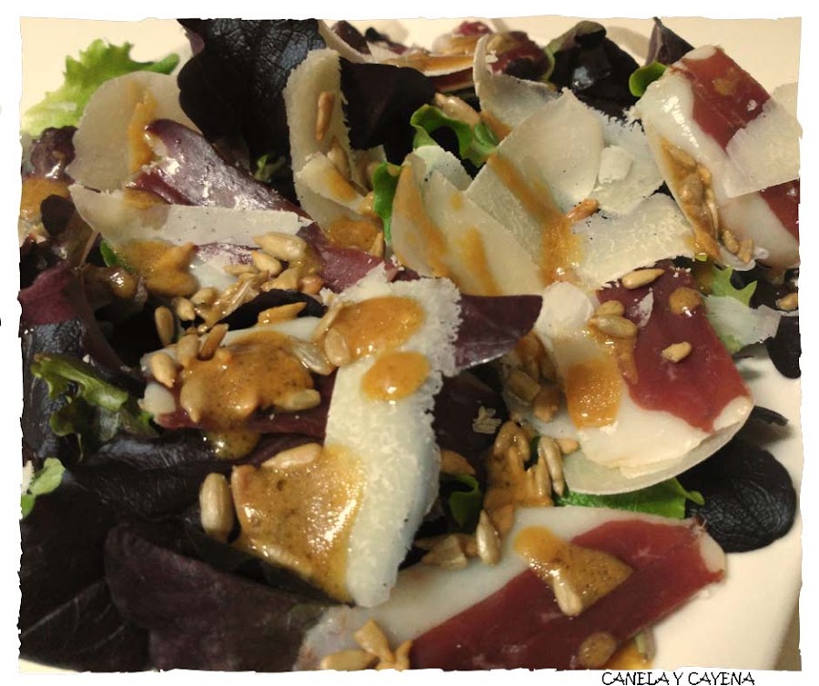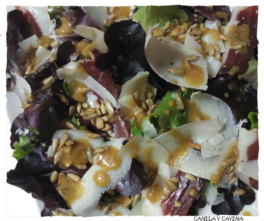 Me encantan las ensaladas de todas las formas y colores, frías, tibias, con frutas.. y contra más originales mejor. Hoy os presento una propuesta de ensalada gourmet con pocos ingredientes, pero que combinan a la perfección, con la que fijo que triunfas en cualquier reunión: ensalada con jamón de pato, lascas de queso parmesano y pipas con un aliño de mostaza y soja...