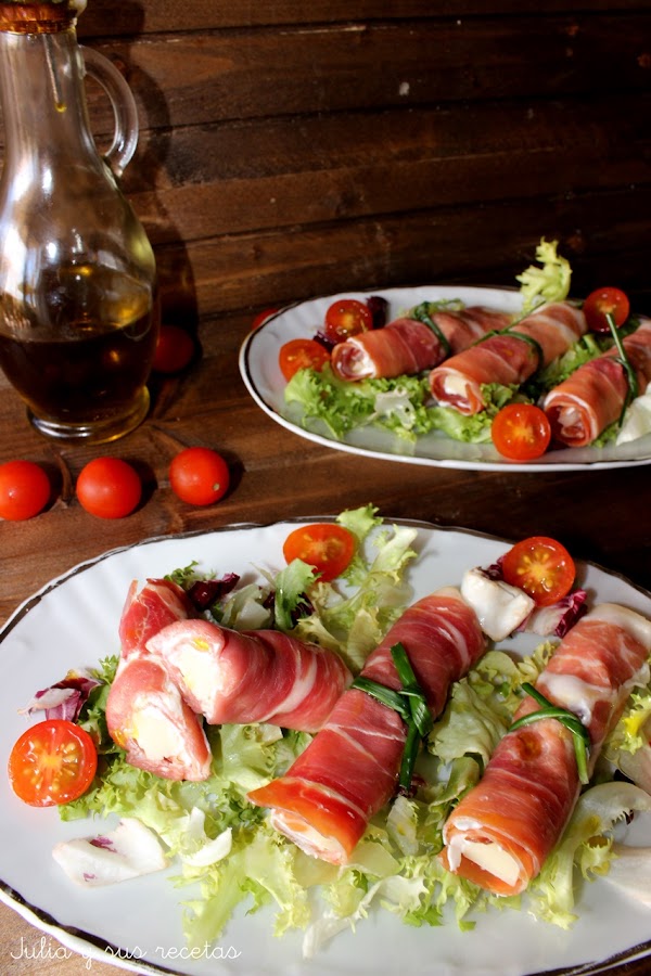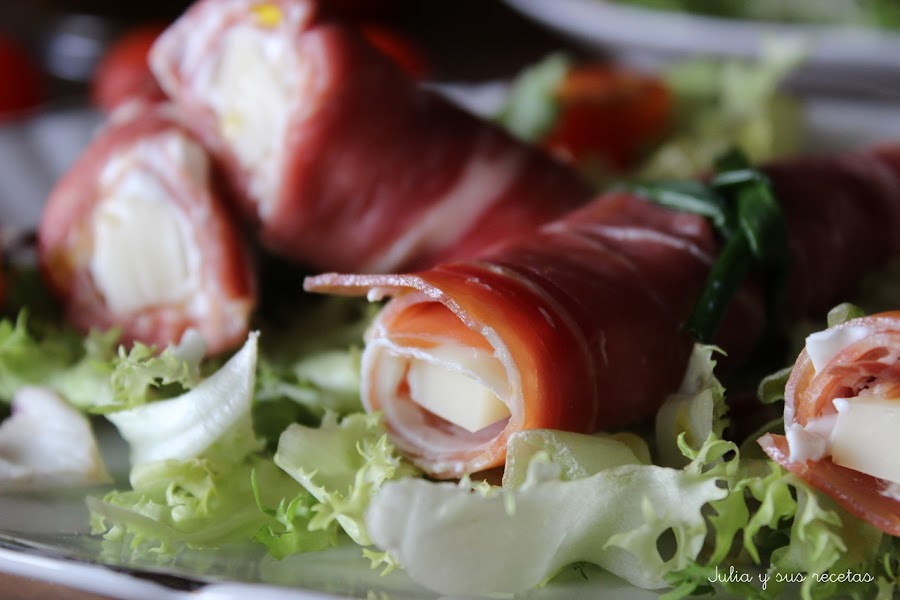 Se pueden hacer muchos platos con jamón, aunque para mi, comerlo tal cual es la mejor forma de degustarlo, hoy he decidido ponerlo en ensalada y mezclado con otro de los productos españoles que mas me gustan, el queso.