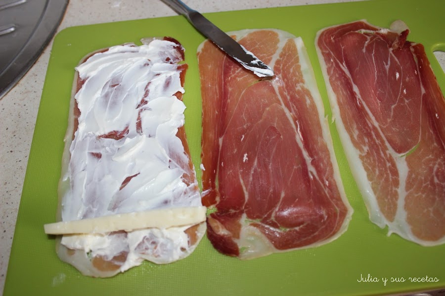 Untamos las lonchas del jamón con el queso crema, le ponemos una tira de queso manchego en un extremo y lo enrollamos.