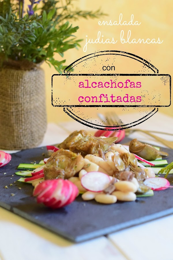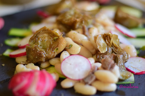5. Para presentar la ensalada ponemos de base las laminas finas de calabacín, colocamos las judias en el centro, alrededor ponemos las laminas de rabanitos y finalmente las alcachofas confitadas.