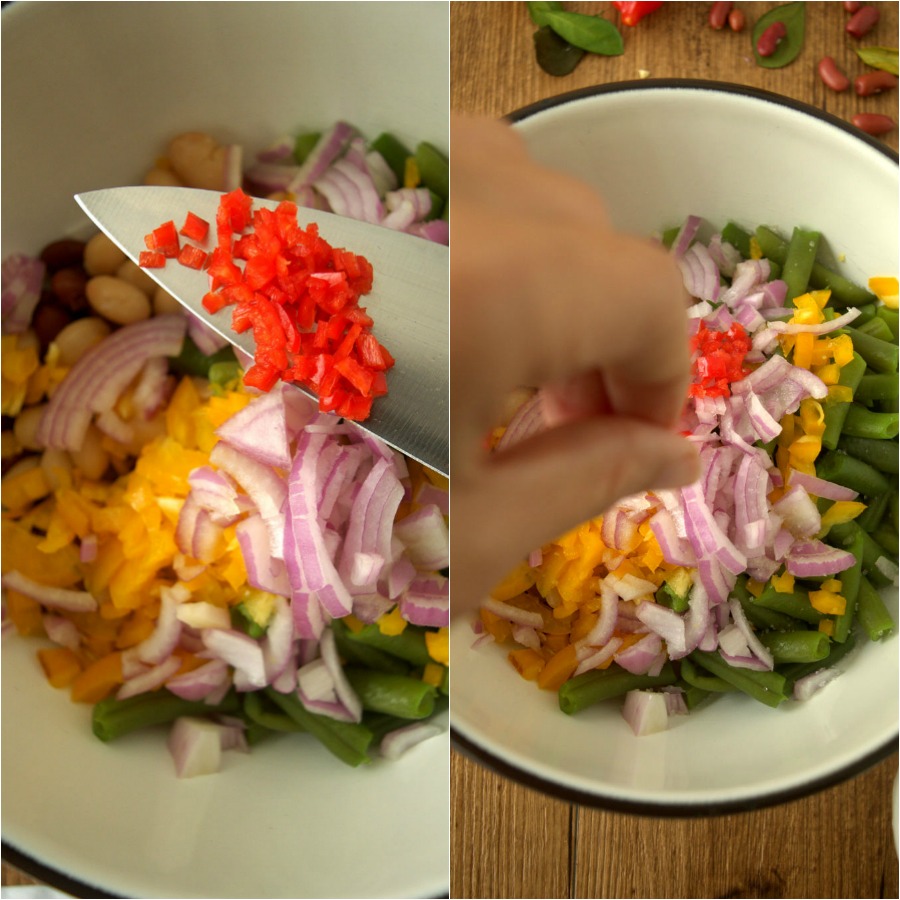Wash and dry, yellow ball pepper, and chopped into small dice. Add to beans.