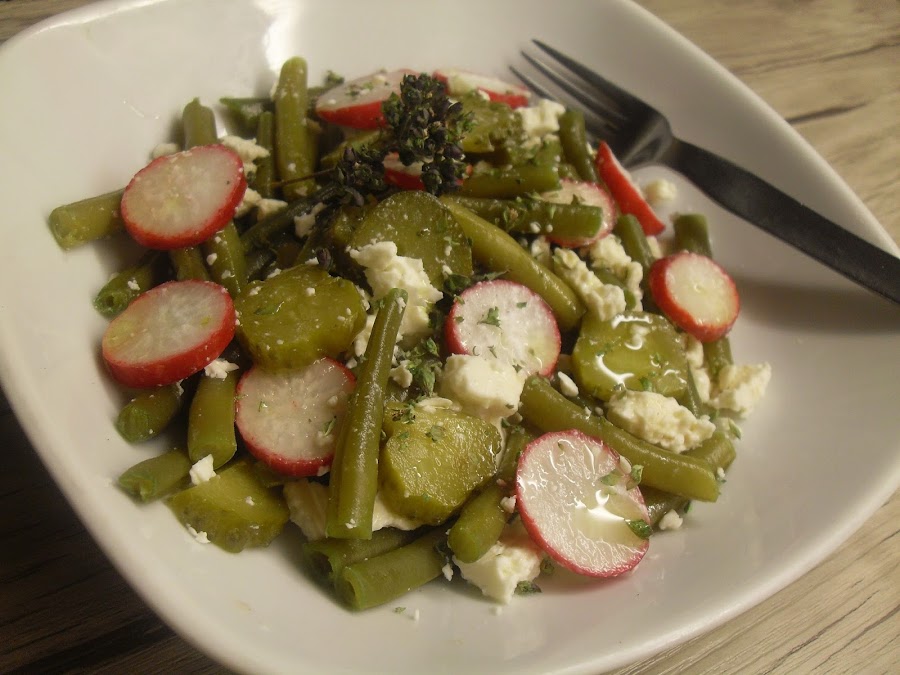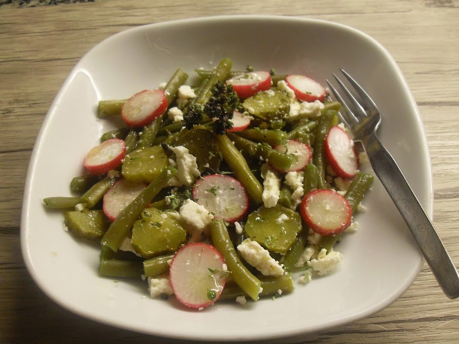 Pasar las judías una vez frías a un bol o cuenco y agregar la cebolla, el cilantro, los rábanos y el queso.