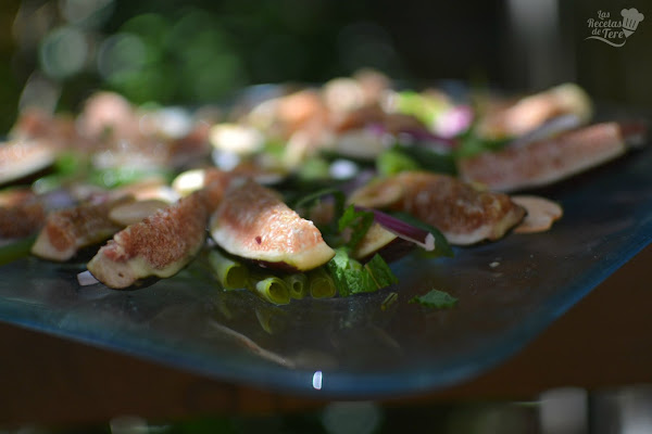 Arma la ensalada, coloca las judías, los higos y riega con el aderezo.Esparce por último las almendras tostadas.