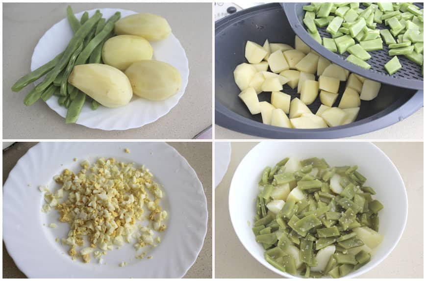 1.-Empezamos cortando las puntas de las judías verdes y si tienen un filo muy grueso, también se los quitamos ya que luego es muy desagradable encontrarse con los hilos que suelen tener en los bordes. Las cortamos en trozos como de un bocado. A continuación cocemos en agua las patatas y las judías verdes por separado, ya que cada uno tiene su tiempo de cocción, hasta que estén tiernos. Este paso lo hice en el Varoma de Thermomix. Ya que lo tengo pues aprovecho, pero quien no tenga Thermomix o no le apetezca usarlo no pasa nada, se cuecen ambos ingredientes y no pasa nada.