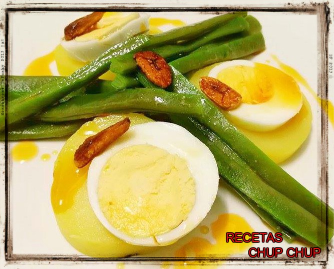 Para montar el plato ponemos primero las patatas, encima de ellas los huevos y las judías, para terminar aliñando con la vinagreta.